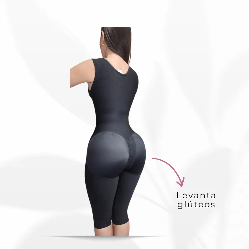 Powernet alta compresión, 3 líneas de broches al frente, busto cubierto, cremallera perineal, espalda cubierta, broches en hombros, levanta glúteos.