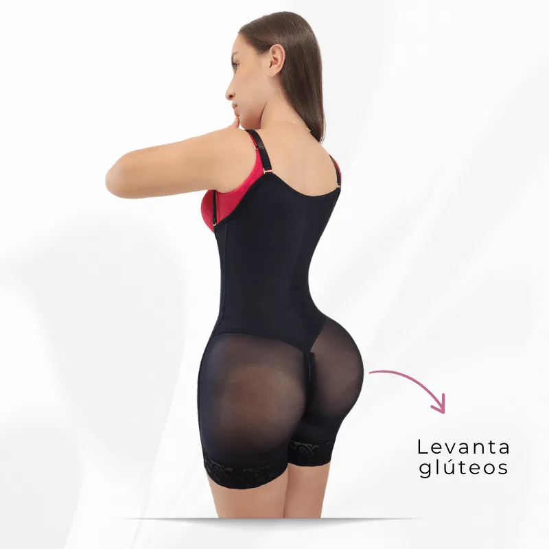 High-compression powernet; 3 rows of clasps; perineal closure; removable/adjustable straps; pre-shaped butt; silicone lace to prevent roll-up.